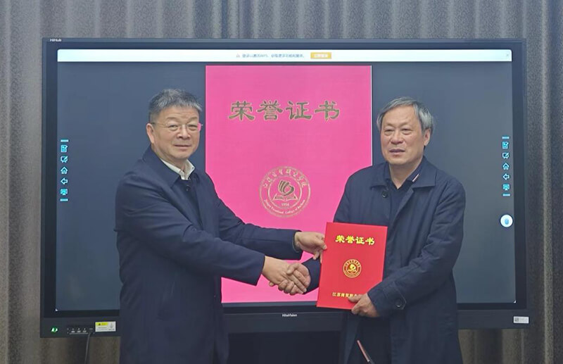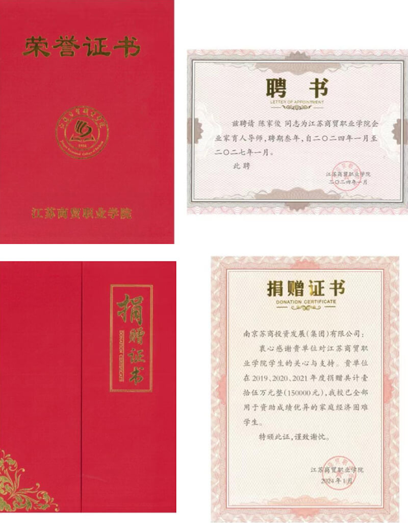 ↑馮志明書記(左)為陳家俊董事長(zhǎng)頒發(fā)榮譽(yù)證書和“蘇商獎(jiǎng)學(xué)金”捐贈(zèng)證書